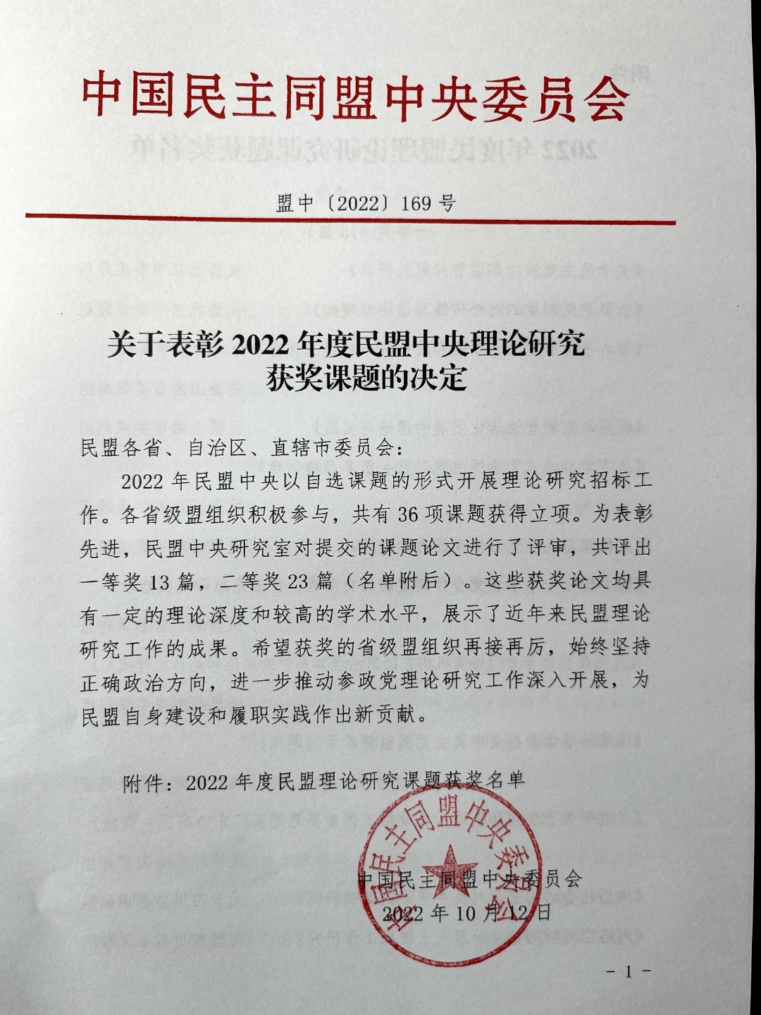 10月12日,民盟中央对2022年度理论研究获奖课题成果进行了表...