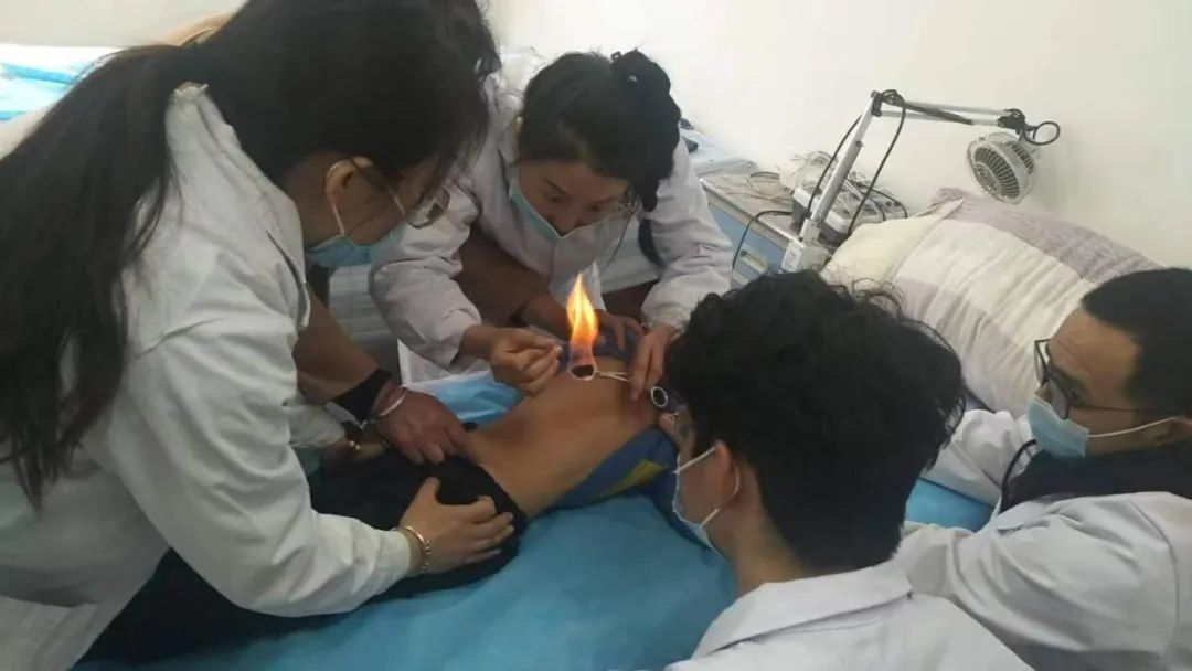 左手执酒精灯,右手执针灸针,针灸针在灯芯和患者的脸...