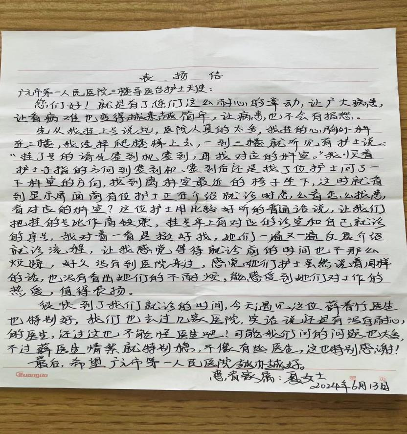 近日,广元市第一人民医院门诊部三楼分诊处收到一封门...
