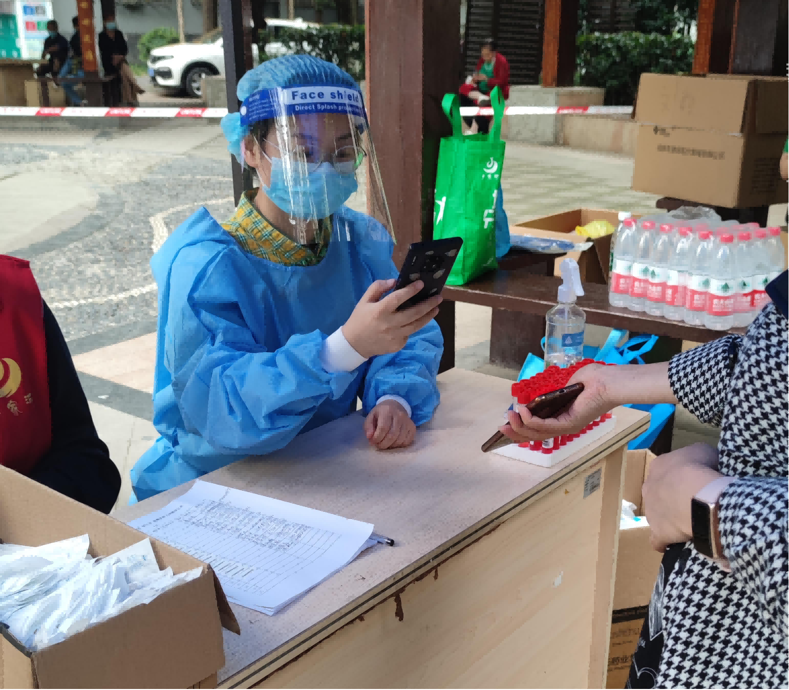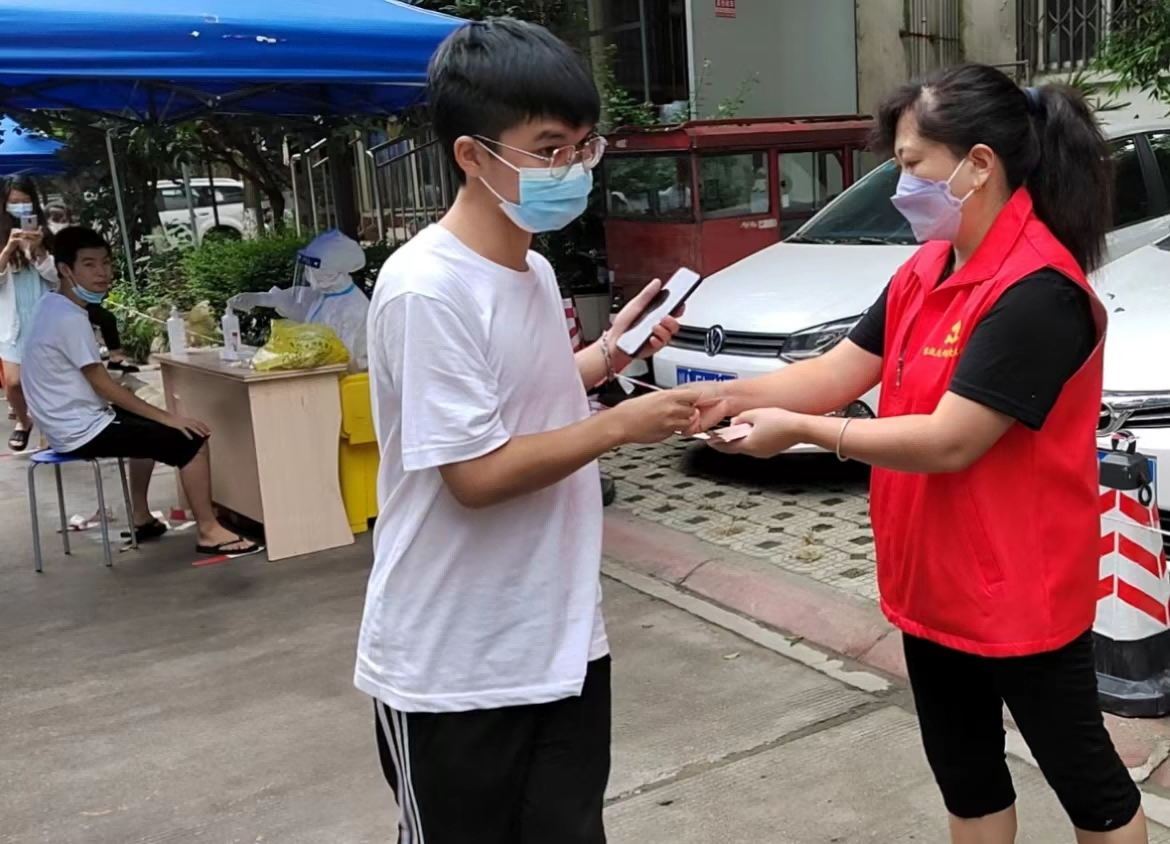1. 肖家河街道新盛社区参加人员6人,在社区主任的安排下主要负责维护核酸检测时的秩序、帮助老年人登记信息、傍晚挨家挨户送出门卡等工作。在信息登记过程中出现网络不稳定的情况,自愿者们坚持在岗,给排队的居民一一沟通,化解他们的焦虑,努力做好解释工作。