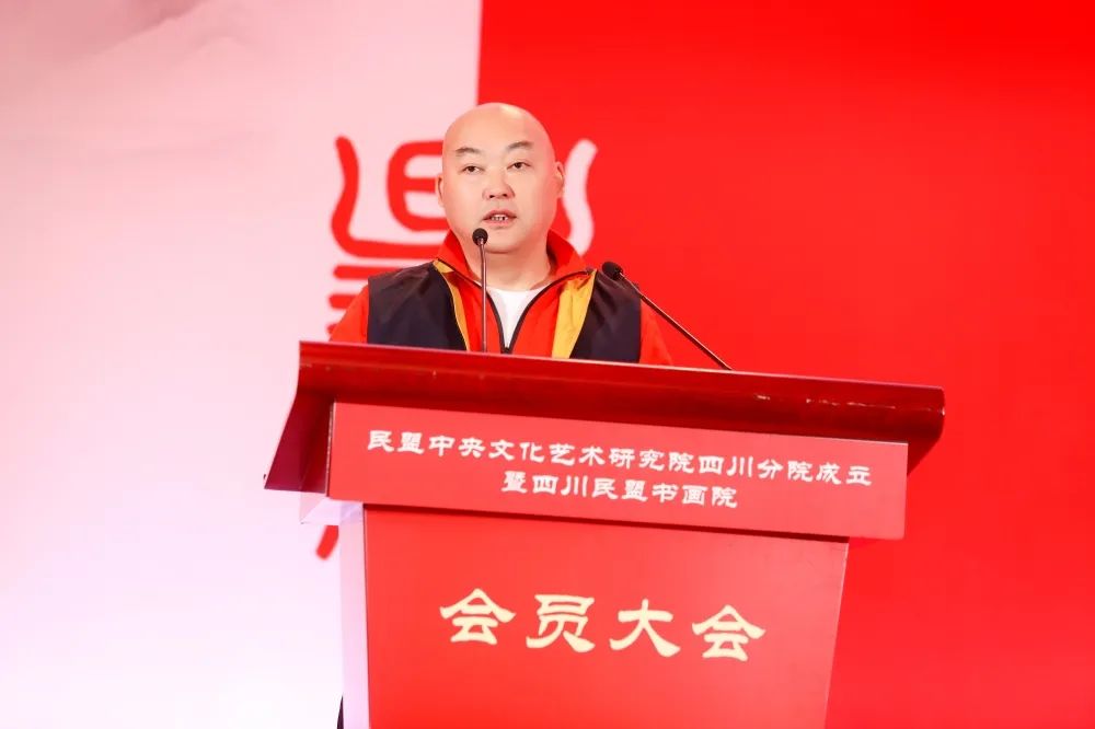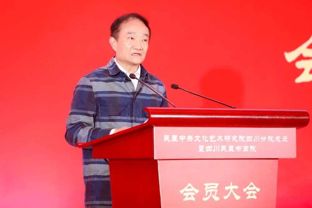 熊方军在讲话中表示将满怀“会须决起凌云志,高抟九万扶摇风”的豪情,秉承“人生万事须自为,跬步江山即寥廓”的意志,踔厉奋发、笃行不怠,一是坚定政治站位,强化界别特色;二是坚持守正创新,创造人民艺术;三是创新工作方式,加强对外交流;四是加强人才培养,提升艺术水平。与各位艺术家一起凝心聚力、守正创新,以不负历史、不负时代、不负民盟、不负统一战线的担当作为,努力把民盟中央文化艺术研究院四川分院和四川民盟书画院管理好、建设好,积极为推进文化自信自强、铸就社会主义文化新辉煌贡献新力量。