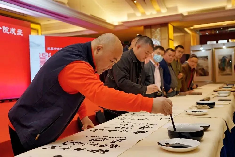 活动现场,民盟中央文化艺术研究院四川分院和四川民盟书画院的12位书画家们以中共二十大报告金句为主要书写内容,合作创作了一幅精美的“学习二十大、书写新时代”大型书法作品以志祝贺。
