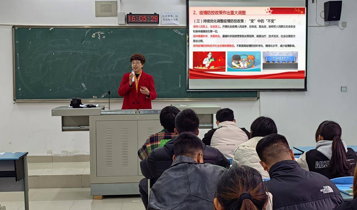 在课堂上,学校领导和思政课教师从“三年抗疫,中国答卷经得起历史检验”和“2023年国家面临的局与势”两个方面,用一个个真实的数据,鲜活的案例,最热的国际国内时政热点,引领学生去认识三年疫情,因时因势不断优化调整疫情防控措施,团结带领全党全国各族人民坚定不移开展抗击疫情斗争,统筹疫情防控和经济社会发展取得的重大积极成果;同时,引导学生思考和认识,党的二十大胜利召开,描绘了全面建设社会主义现代化国家的宏伟蓝图,每一个大学生作为青年一代的主力军,肩负着时代使命和责任,要关心国家大事,关注社会热点,学会思考,正确看待身边的大小事,在马克思主义理论的指引下,树立正确的世界观、人生观和价值观,脚踏实地,笃实好学,以实干和奋斗开启新学期的新征程。