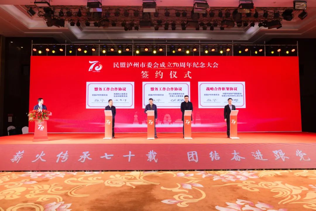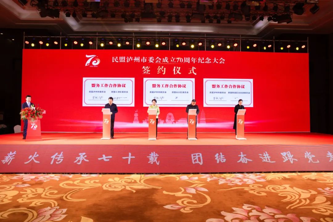 会上,泸州市政协副主席、民盟泸州市委主委杜旭林,宜宾市政协副主席、民盟宜宾市委主委廖霆,泸州市政协副主席、民革泸州市委主委刘旭晴先后致辞。泸州民盟与重庆市江津区、永川区、荣昌区民盟分别签订盟务合作协议,与民盟省委会社法委、新联会、平安产险泸州中支公司分别签订盟务合作、招商引资、社会服务合作协议;为泸州民盟盟龄40年以上盟员颁发纪念章,举办泸州民盟70周年展。纪念大会由民盟泸州市委副主委、泸州市金融工作局局长熊建辉主持。