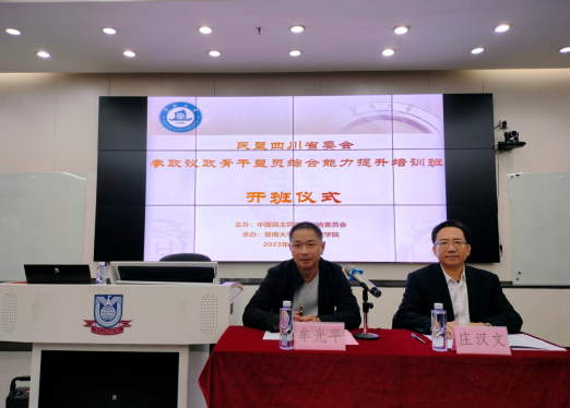 12月5日,2023年四川民盟骨干盟员综合能力提升培训班在广州暨南大学顺利开班。来自全省各级民盟组织的参政议政骨干盟员和机关干部,共计30余人参加培训。暨南大学党委常委庄汉文,民盟四川省委会副秘书长牟光平、参政议政处处长柏相出席开班仪式。
