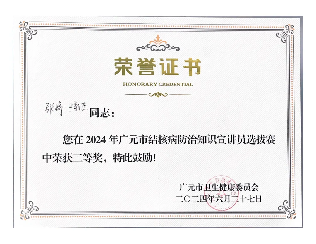 6月27日上午来自全市各级结核病防治机构、大中专院校15名选手在川北幼儿高等专科学校参加比赛。广元市中医院呼吸与危重症医学张婷、王新杰两名选手获得二等奖荣誉。他们结合学科知识和工作实践,聚焦当下公众的健康需求,围绕结核病防治、健康生活方式、国家惠民政策等内容,模拟电视科普栏目,解答人民群众对肺结核关注的重点问题,内容丰富、形式新颖。