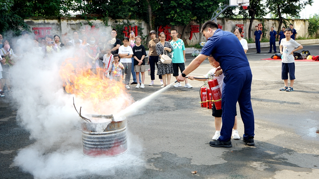 为了让孩子们体验灭火感受,消防员一次次地点燃油桶,孩子们从胆怯慢慢地变成踊跃,都想亲手消灭掉“火魔”。