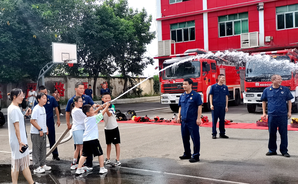 在孩子的眼中,消防员会救人、救火,是无所不能的“超人”;在孩子的心中,消防员是最神圣的英雄。在八一建军节即将来临之际,为了深化军民融合以及关爱职工子女暑期健康生活,营造浓厚的双拥氛围和 “快乐‘童’行”亲子拓展研学活动。7月23日上午,四川能投川化工会组织部分职工及其子女来到青白江区消防救援大队团结西路专职消防救援站,开展“我们也爱蓝朋友·快乐‘童’行”拥军亲子联谊活动。