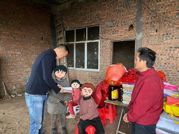 图2宜宾市机械工程商会会长杨齐松与受助家庭小朋友亲切交谈