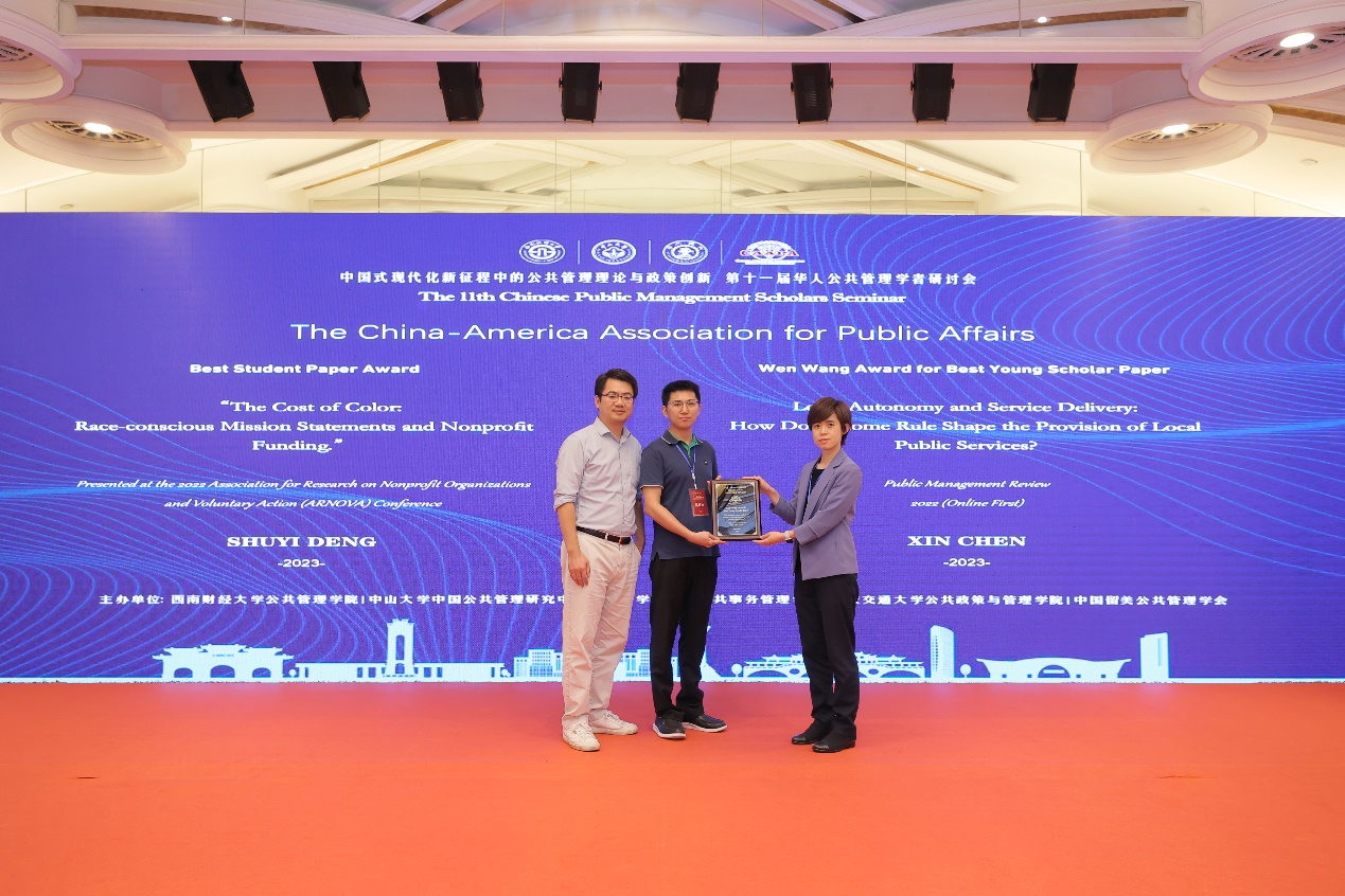 闭幕仪式环节,美国罗格斯大学终身教授张鹏举介绍了CAAPA奖项的发端与沿革,并为中山大学政治与公共事务管理学院陈馨教授颁发了“王闻青年学者论文奖”、为明尼苏达大学邓淑仪博士颁发了年度“优秀学生论文奖”。