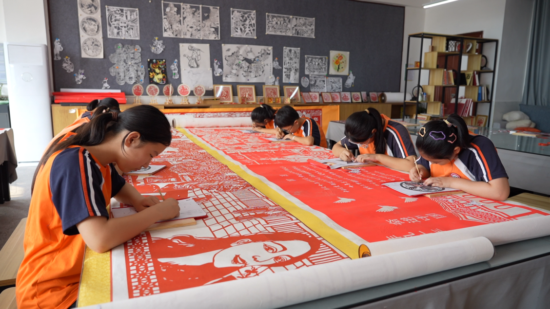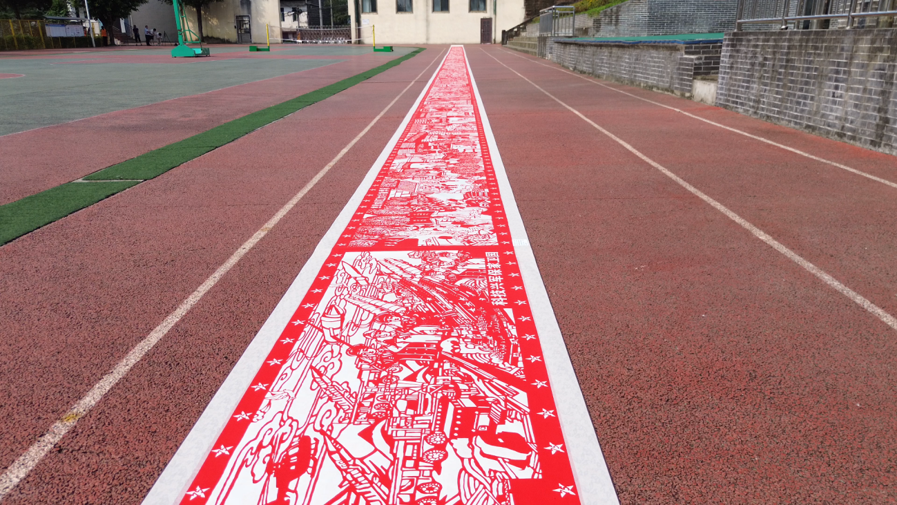 绘制图案、剪刻、镂空……9月26日上午,在唤马小学剪纸工作坊,随着最后一幅剪纸作品的诞生,这一历时5个月制作的10幅剪纸作品宣告完成。经衔接装裱后,孩子们迫不及待地将这幅长达75米的剪纸作品搬运至学校操场上,并将长卷缓缓铺开,细细品味,老师们也纷纷拿出手机为同学们拍照,记录下这难忘的时刻。