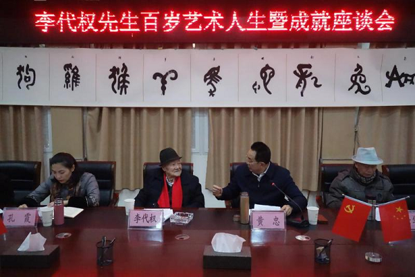 座谈发言十分踊跃,一致激情盛赞李代权先生的才艺与人品,一致赞叹他百岁高龄头脑清醒、坚持每天养生写字,赞叹会场上张挂的他最近的篆书和行书作品!