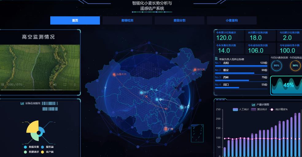 利用无人机进行低空及高空的信息采集,低空采集主要收集农田细节纹理信息,高空采集主要收集图像宏观信息。在后期团队通过高空图像利用语义分割算法精准分割农作物和异常空缺,对于低空图像进一步分析作物的细节信息,主要在小麦后期利用目标检测算法检测单位面积麦穗赤霉病情况和麦穗个数,最终输入模型计算作物产量,从而实现预测小麦产量的最终目的。