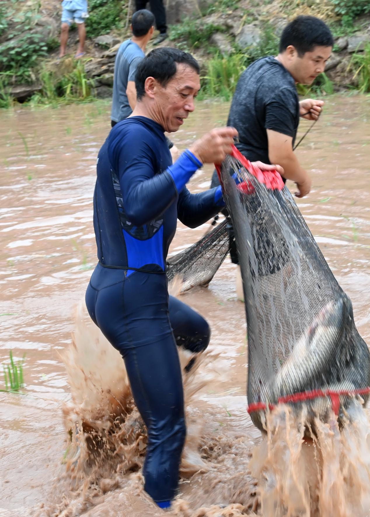 比赛中,稻田抓鱼项目选手激情捕获三条大鱼。(刘徽摄)