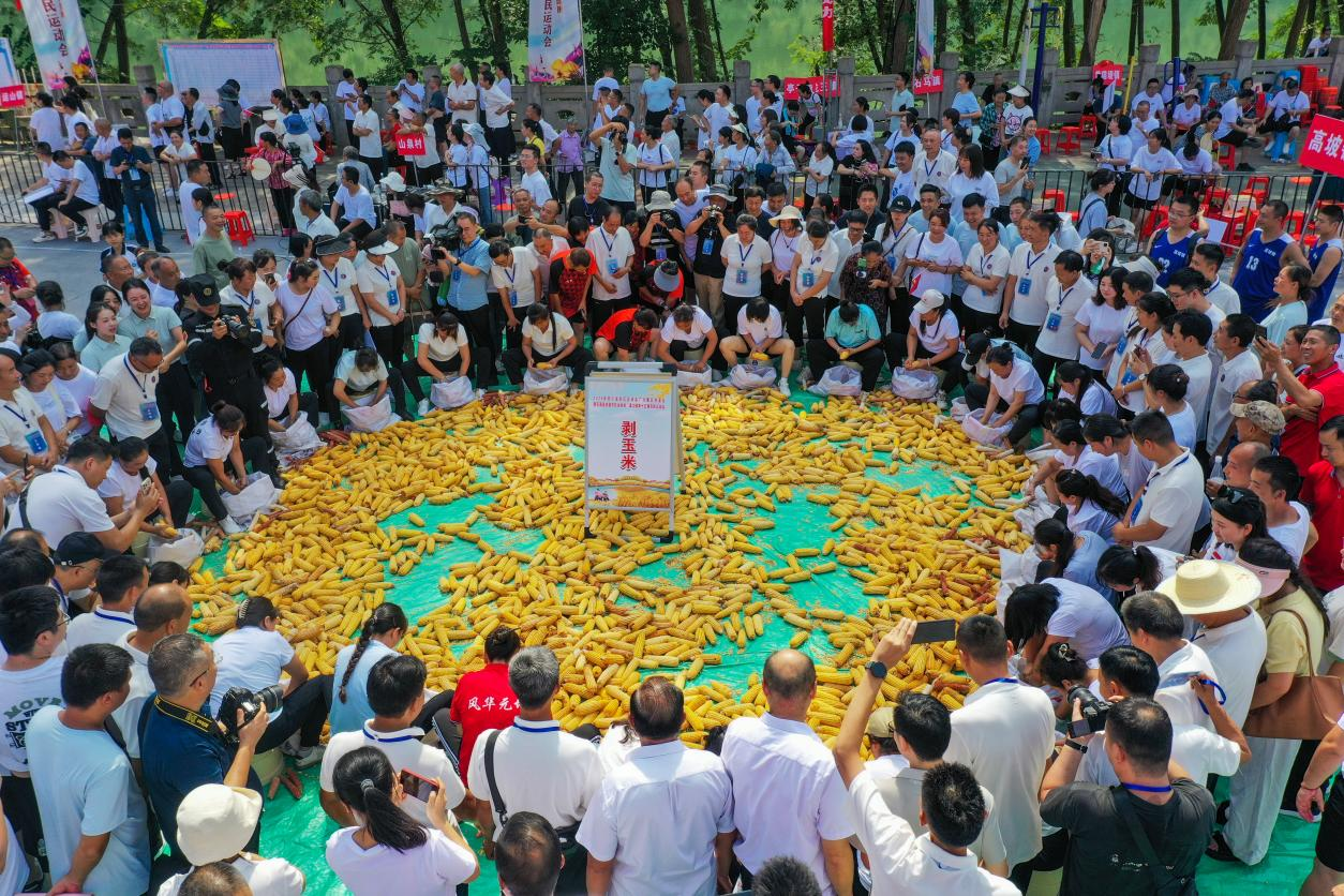 比赛中,选手围坐在成堆的玉米旁剥下丰收的喜悦。