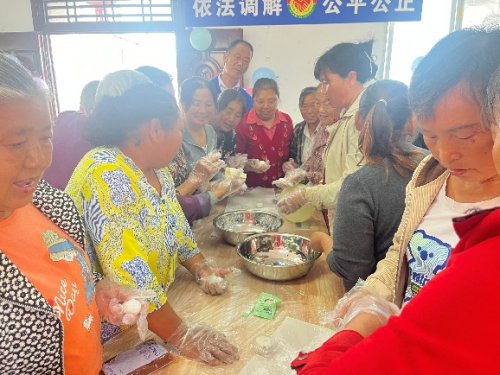 活动开始,我们的村民们早早赶到村委会一起布置活动现场、营造节日氛围。紧接着我们先开始手工制作月饼,体验低碳中的人文温度,从揉面、包馅到压模,村民们分工合作,你揉面、我包馅、我压模,活动现场热闹非凡。通过手工制作月饼让村民在动手过程中感受文化内涵。