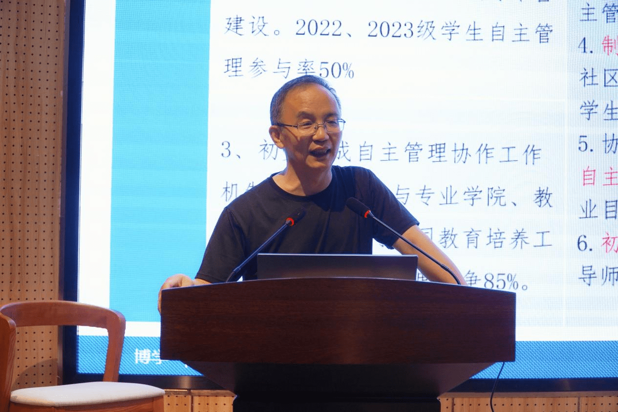 学工服务中心主任詹廷君详细解读了《绵阳城市学院学工自主管理工作实施方案》。他指出:“学院自主管理特色建设培养新模型的核心内容就是把学生在校四年和出校门后的五年,分成三个阶段,通过自主管理操作系统帮助学生建立三个阶段的目标和实施目标的规划,根据特色建设新构的教育教学的逻辑关系,重构培养新模型,逐步完善在每年的人才培养方案中。按照科技时代社会发展的要求,鼓励学生学习使用通用人工智能完成目标的知识储备,在实践中学习应用专业人工智能具备实现目标的能力。为此,要创建引领行业发展的人工智能业务模型(作品、产品、商品)和业务场景(工单制、工作制、工坊制),建设与此匹配的人工智能化的行业示范基地,以此帮助和指导学生在训练专业人工智能的应用中,同时进行适配人才的培养和不断的提升,让示范基地的实习实训、运营等实践与继续教育相互作用,帮助学生实现学业、职业、事业三段目标,并创造就业先于毕业前的新目标,这就是绵阳城市学院为学生打造三段九年人才培养的新模型。”