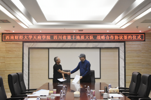 苏画代表四川省第十地质大队对刘强一行的到来表示热烈欢迎。苏画从历史沿革、发展规划、单位基本情况和科技创新等方面介绍了十大队的基本情况。他表示,学院作为地质人才的培养基地和地质科研工作的孵化器,不仅能为十大队注入源源不断的新鲜血液,还能为十大队的科技创新工作提供新的思路和方向;双方签署战略合作协议,能更好地发挥自身的人才、科研、资源和市场优势,最终实现相互促进、共同发展。