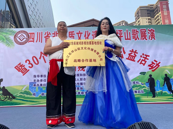 在展演过程中,四川华辰谢鸿影视拍摄基地法人丁小丽,向内江石坪山歌文化传播有限公司授牌,与该公司建立起了互惠互利的战略合作关系。参与活动的嘉宾,企业界爱心人士黄信平为现场30名残疾人代表赠送了御寒的被套,价值近5000元。