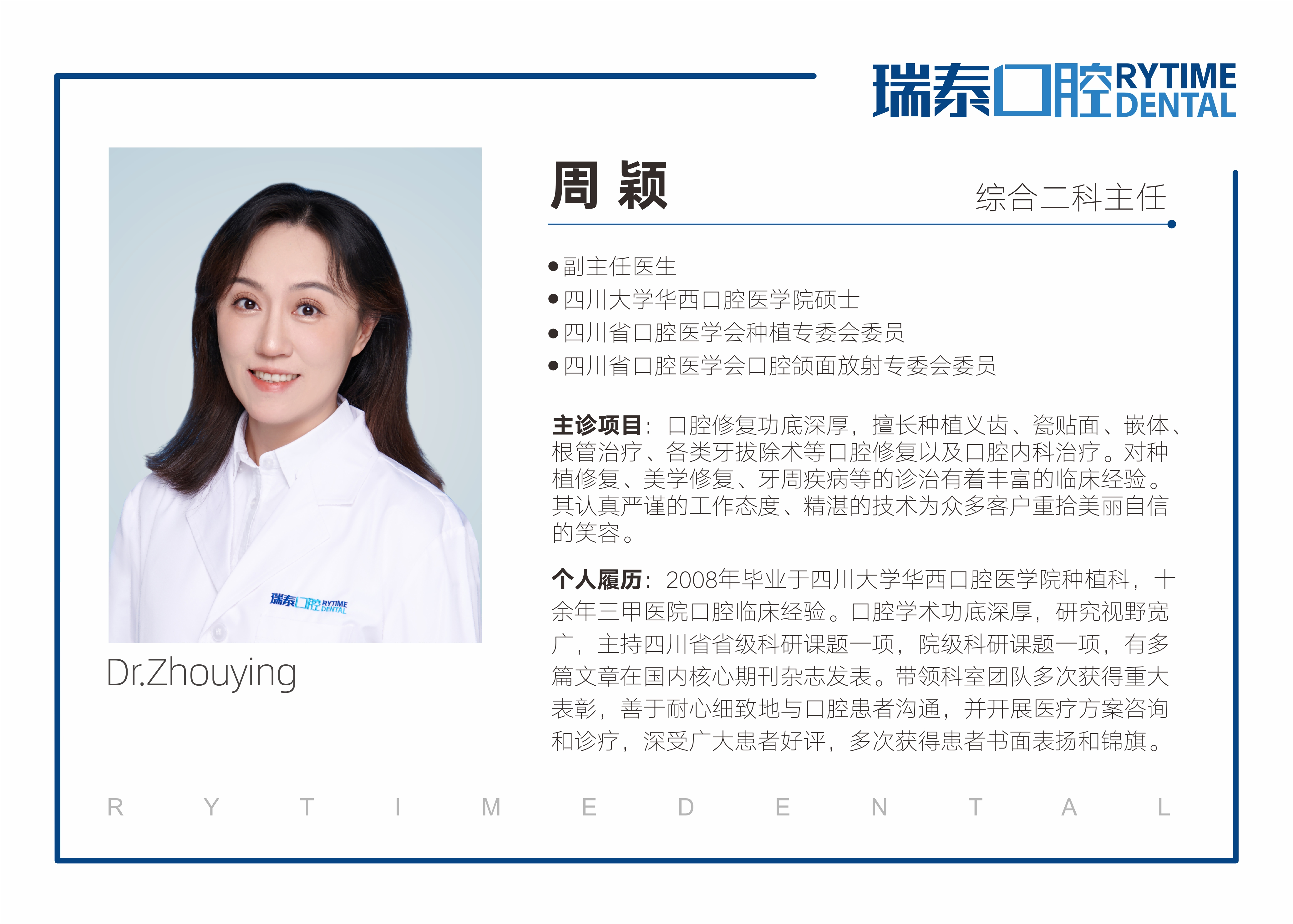 2008年毕业于四川大学华西口腔医学院种植科,十余年三甲医院口腔临床经验。口腔学术功底深厚,研究视野宽广,主持四川省省级科研课题一项,院级科研课题一项,有多篇文章在国内核心期刊杂志发表。带领科室团队多次获得重大表彰,善于耐心细致地与口腔患者沟通,并开展医疗方案咨询和诊疗,深受广大患者好评,多次获得患者书面表扬和锦旗。