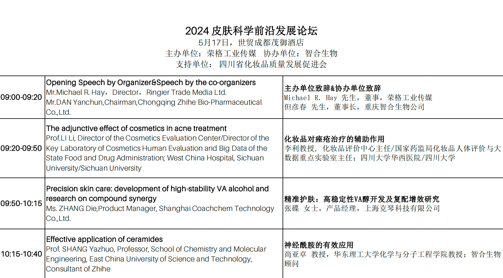 重庆智合生物医药有限公司(以下简称智合生物)将以本次论坛协办单位身份出席,作为中国神经酰胺原料行业独角兽,以其在合成生物学、化妆品应用技术、药物技术开发等领域的深厚研发实力,向业界展示其在神经酰胺领域的创新成果。