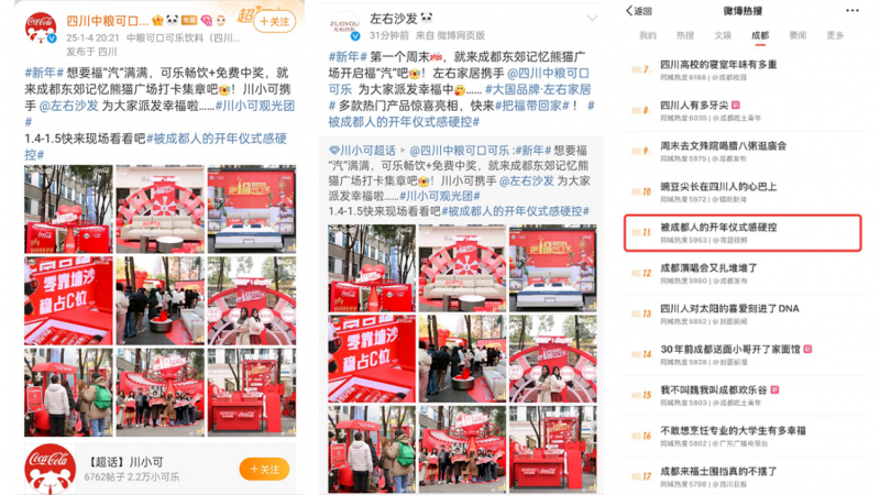 成都东郊记忆人流如织,现场活动吸引大批群众围观,加上用户在各大新媒体平台积极分享活动讯息,#被成都人的开年仪式感硬控 直接登上成都同城热搜榜,阅读量累计高达5千万,话题最高冲上微博同城热搜榜第11位,并持续在榜超24小时!