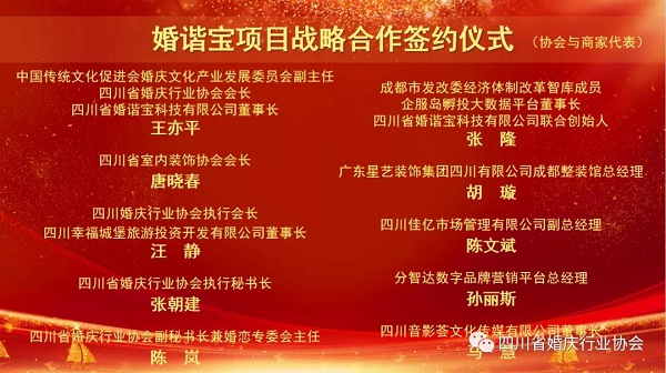 来自成都滨江支行领导、成都锦江区、高新区民政部门代表、兄弟行业协会领导、省婚协会员企业代表出席签约仪式。