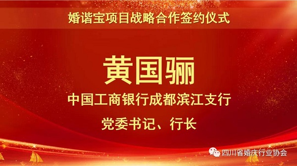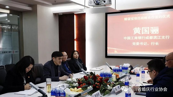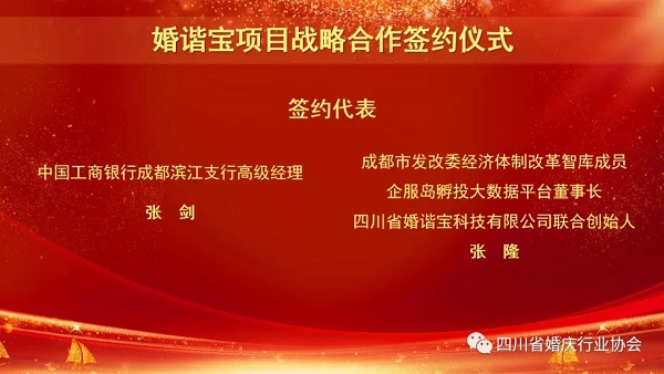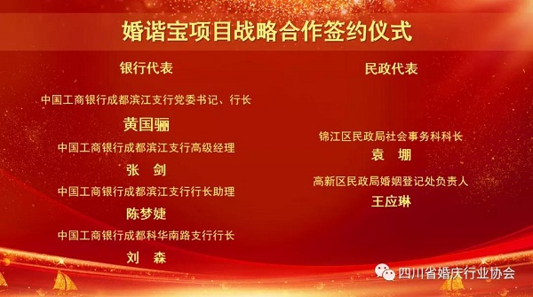 工行成都滨江支行一直以来都以支持我市民生计划、鼓励金融创新为己任,积极顺应数字经济时代发展趋势,不断尝试探索惠及民生的各类线上金融业务的拓展转型,而本次婚协在婚庆领域的超长产业链和消费链以及特定消费群体,是工行一直关注的新赛道,我行近年来也积累了大量的“互联网+”智慧金融平台建设经验,因此,对于《婚谐宝》项目,我行将给予充分的配合,与省婚协以及民政部门携手共建,做好配套的金融服务。