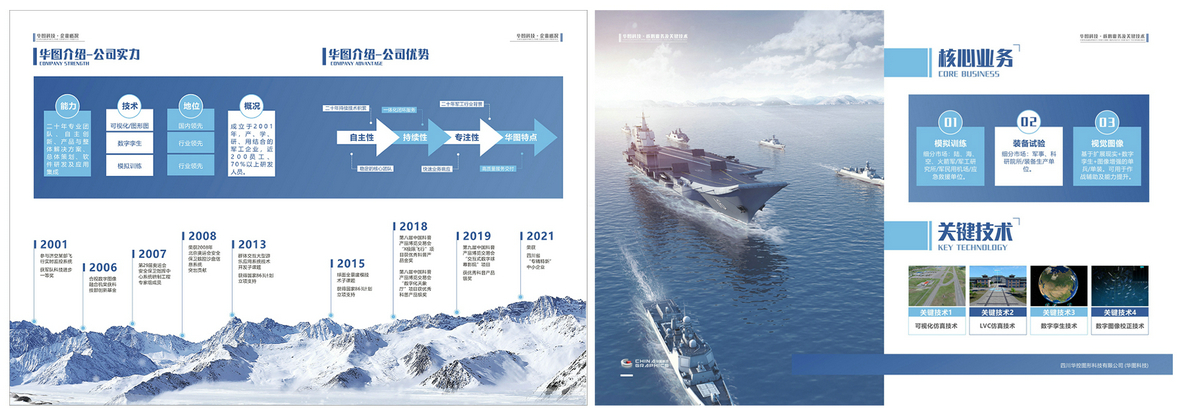 公司是国家认证的高新技术企业与软件企业,成都市军民融合企业,四川省“专精特新”中小企业,拥有ISO9001:2015质量管理体系和完备的军工资质,具备非常强的自主研发能力,已拥有发明专利及其他自主知识产权70多项。基于自主研发的数字孪生、LVC仿真、可视化、XR与人机交互、知识图谱等核心技术,研发提供高可信的孪生战场环境、面向LVC仿真及实时异地联网的试训云平台、高逼真度视景仿真引擎、超高清球幕系统等产品及解决方案,已在模拟训练、数字孪生,沉浸式文旅等领域取得不错成绩,应用于多个国家重点武器型号、大型军事演训任务,以及北京奥运会安保信息系统等重大工程。近三年来,尤其在军事试验训练保障及作战实验仿真领域,实现了技术的创新和突破,形成了军事模拟训练及作战实验仿真相关应用典范。
